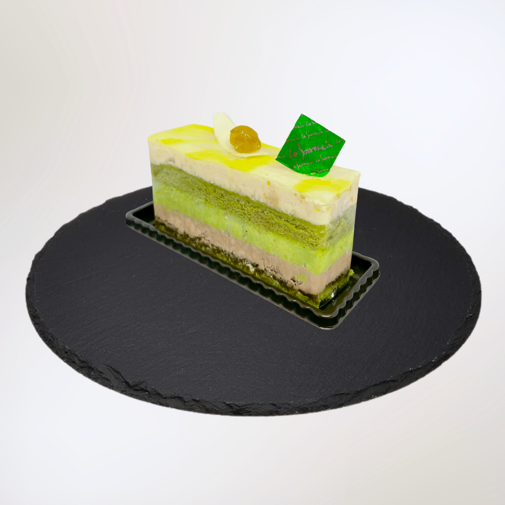 和の素材~柚子・抹茶~を使用し、フランスの伝統菓子オペラの様に仕上げました。